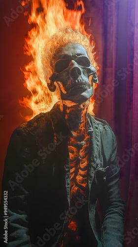 An illustration of a skull and skeleton man in a suit, engulfed in flames.