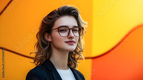 Portrait de jeune femme avec lunettes sur fond dynamique jaune et orange