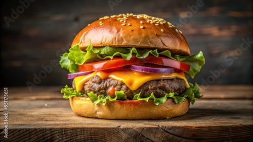 Tempting close-up shot of a gourmet homemade cheeseburger , Delicious, burger, cheeseburger, food, gourmet, homemade, close-up, juicy