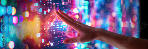 A hand reaches out to touch a brightly lit digital display filled with colorful patterns and vibrant lights