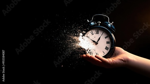 A hand holds a shattered clock, symbolizing the passage of time and the fragility of moments in a striking composition.