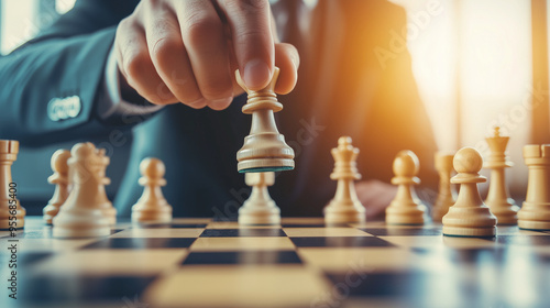 Mężczyzna w garniturze przesuwa pionka na szachownicy, symbolizując strategiczne myślenie i planowanie.