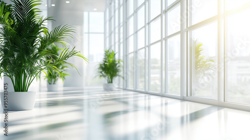 Stylowe biuro z dużymi oknami i zielonymi roślinami, które wprowadzają naturalne elementy do jasnej, przestronnej przestrzeni. Czystość i elegancja wnętrza tworzą inspirującą atmosferę pracy.