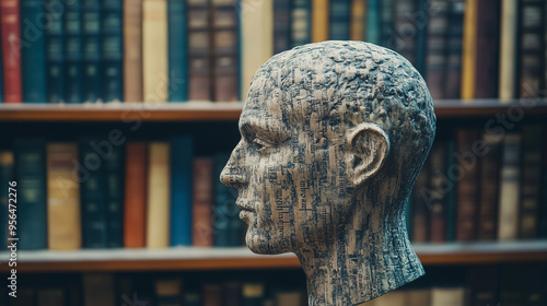 Wizualizacja ludzkiej głowy, w której krążą idee i koncepcje, symbolizując nieskończony potencjał ludzkiego umysłu do zdobywania wiedzy i tworzenia nowych rozwiązań.