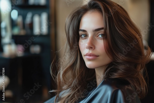 Beautiful brunette woman in her 30s looking at the camera, with lush hair in a hair salon, Fresh Blow Wave or Blow Dry and Styling.