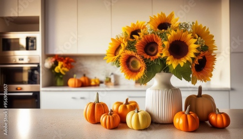 Sunflowers and pumpkins on the kitchen counter. Autumn kitchen arrangement