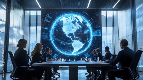 High-tech conference room with a digital globe projection, diplomats in formal attire engaging in discussions