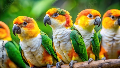 Vibrant caiques dazzle with their bright, iridescent feathers, their playful antics a joy to behold as they frolic in the lush South American jungle.