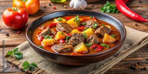 Traditional Hungarian beef goulash soup and stew with chuck steak, potatoes, and paprika, Hungarian, food, cuisine, beef