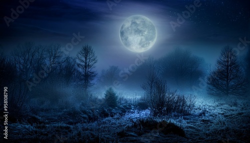 Jesienna, mglista noc z księżycem ponad drzewami. Nocny, jesienny krajobraz