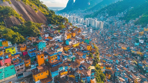 Vibrant and Chaotic Favela Neighborhood with Colorful Hillside Houses and Rooftops in Rio de Brazil