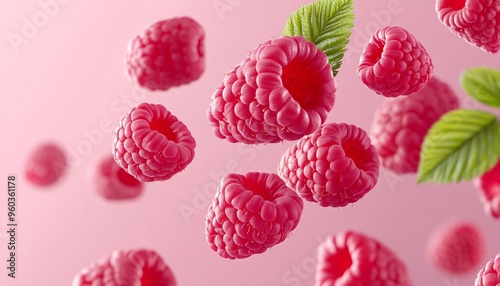 Floating raspberries on a vibrant red backdrop creating a dynamic fruit and vegetable background aesthetic.