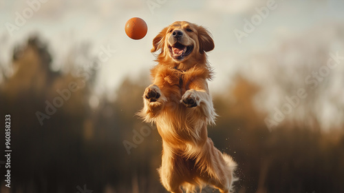 Radosny golden retriever w pełnym skoku w powietrzu, z uśmiechniętą mordką i skoncentrowanymi oczami, chwytający w powietrzu piłkę.