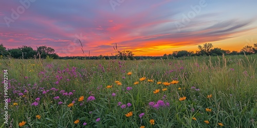 a colorful sunset sky over blooming late summer native wildflowers in a midwest prairie conservation habitat