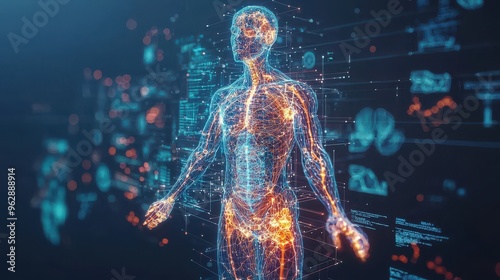 A futuristic representation of a human body, highlighting neural connections and data flow, symbolizing the fusion of technology and biology