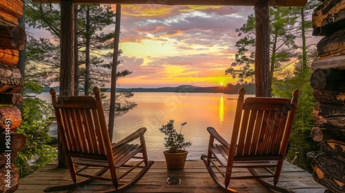 Serene lakeside sunset scene featuring wooden rocking chairs on a porch, with a potted plant and a view of the sun setting over the water