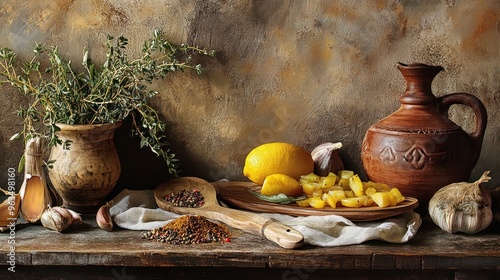 Still Life with Lemons, Garlic, Spices, and Earthenware