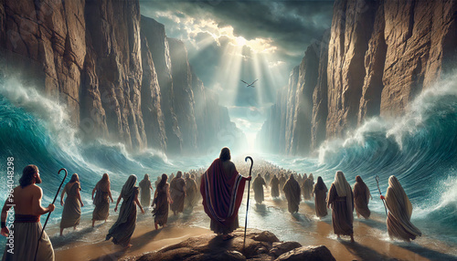 Moïse guidant le peuple juif lors de l’exode des hébreux à la sortie d’Égypte lors du passage de la mer rouge, Moise qui ouvre les flot de la mer rouge, illustre et symbolise le récit biblique