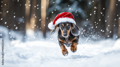 Widok na psa w czapce Świętego Mikołaja, który radośnie biega i skacze w zimowym lesie pełnym śniegu.
