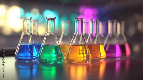 Nowoczesne laboratorium chemiczne, gdzie trwają intensywne badania i prace rozwojowe. Na stole widoczne są różne akcesoria laboratoryjne, takie jak pipety, kolby i probówki.