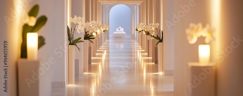 Elegant spa corridor with fresh orchids, soft lighting, and marble floors, representing sophistication