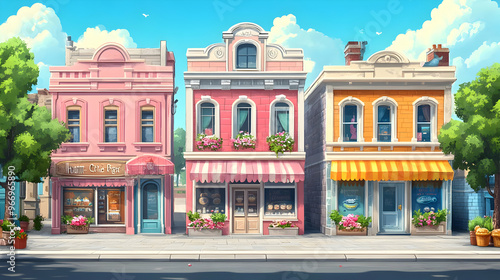 Colorful storefronts with flowers and awnings in a cheerful urban setting.