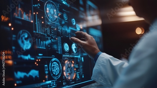 A doctor uses a touchscreen computer to analyze medical data. The screen displays graphs, diagrams, and medical images.