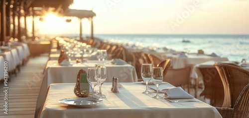 Elegant restaurant with beautiful sunset view, featuring neatly set tables and a serene ambiance perfect for fine dining experiences. Indulge in a serene and romantic atmosphere along the waterfront