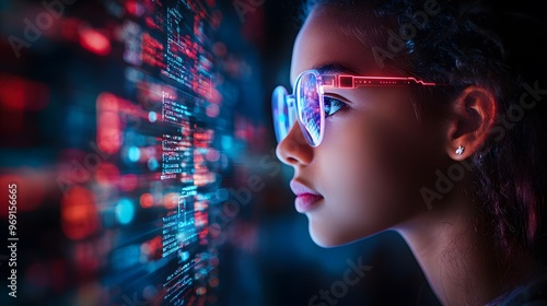 3D animated girl focusing on a tablet for online learning, transparent background, interactive educational content on the glowing screen.