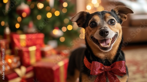 Dog smiling widely while wrapped in shiny holiday paper with a big festive bow standing in a holiday-decorated room