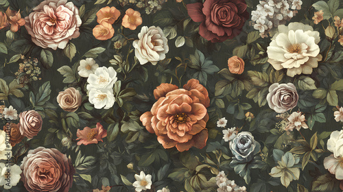 Lush vintageinspired floral wallpaper intricate botanical illustrations in muted earthy tones ornate details reminiscent of victorian era designs. Victorian Era. Illustration
