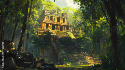 Forest mayan style ancient culture. mayan civilization forest cave. concept art illustration painting of a beautiful ancient temple in the jungle. Aztec Civilization. Illustration