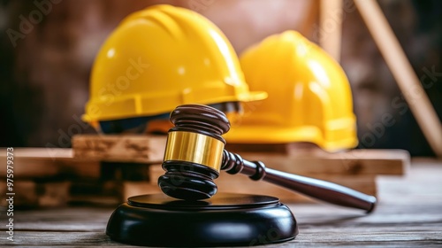 Wooden gavel and a construction worker helmet placed together, illustrating legal protection of industrial labor rights.