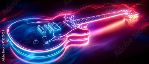 A vibrant electric guitar illuminated with colorful neon lights, showcasing a dynamic blend of art and music in a dark setting.