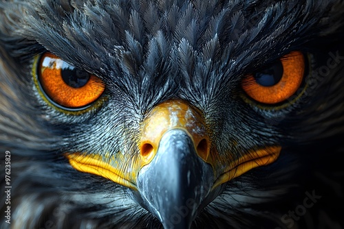 Close-up of intense eagle eyes with sharp details and fiery orange irises