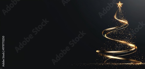 Abstract Christmas tree formed by golden light particles and ribbons, star shining at the top, minimalist dark scene, modern holiday elegance, festive glow