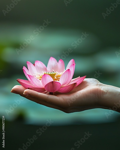 Pink lotus flower held gently in a hand, symbol of purity and peace.