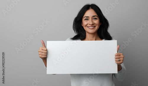 Uśmiechnięta kobieta w średnim wieku, trzymająca pusty arkusz papieru z gestem ok - kciukiem uniesionym do góry, na szarym tle.