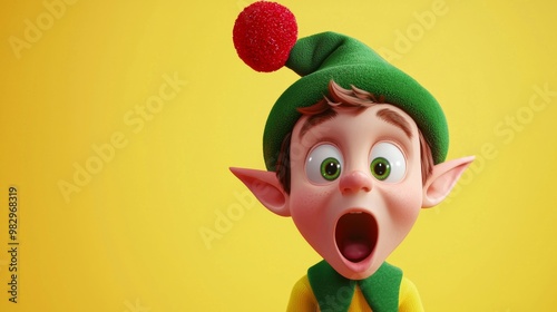 Surprised 3d christmas elf on a yellow background, embodying holiday spirit with a funny expression. Perfect for adding humor and joy to projects!