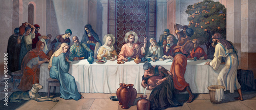 ASTI, ITALY - SEPTEMBER 10, 2024: The fresco of the Wedding at Cana in the church Santuario di Nostra Signora Porta Paradisi by Giovanni Bevilacqua (1950).