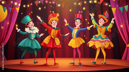 Traditional british pantomime actors on stage in theater wearing colorful costumes they are performing and singing and wear makeup english theater concept. Traditional Costume. Illustration