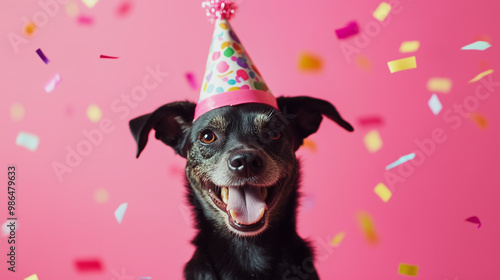 Pies w czapeczce urodzinowej z radością w oczach, skacze wśród spadającego konfetti, celebrując swoje urodziny pełne zabawy i śmiechu.
