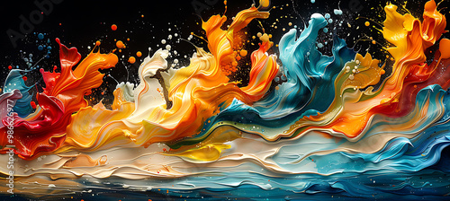 Captivating Abstract Art piece where 2D brushstrokes form a river that flows into 3D mountains symbolizing the journey of life and the passage of time creating a dynamic and fluid visual experience