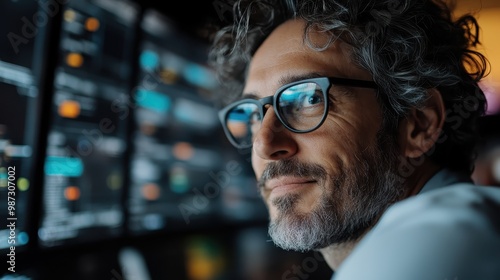A person is focused on working with several computer screens displaying various data and graphs in a dimly lit room. The ambient light creates a tech-savvy atmosphere.