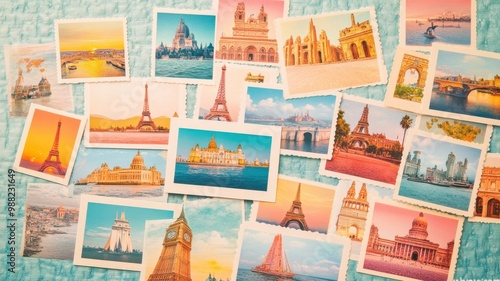 A vibrant collection of travel postcards showcasing famous landmarks from around the world in soft pastel colors.