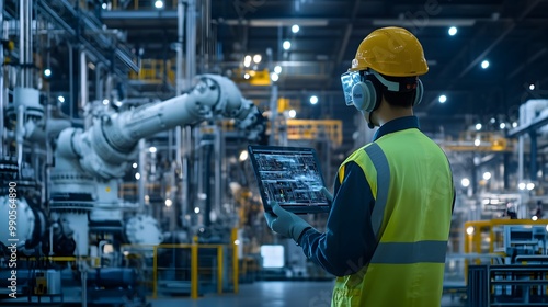 A man in a yellow and green safety vest is holding a tablet and looking at it. He is wearing a hard hat and safety glasses