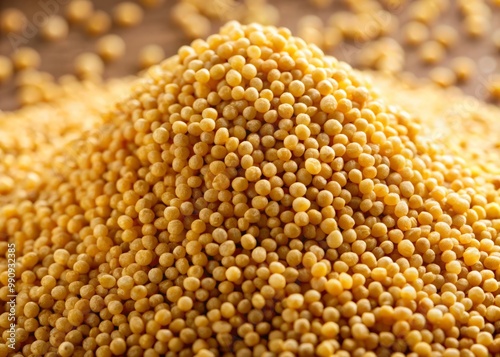 Organic proso millet grains in a heap, their soft, gentle curves radiating warmth and wholesomeness, inviting