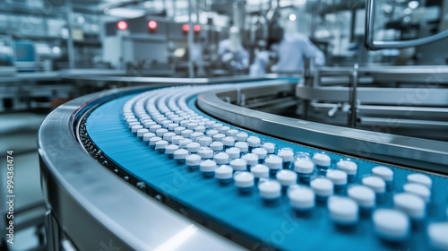 Wysokiej klasy fabryka farmaceutyczna, gdzie zaawansowane roboty i taśmy produkcyjne przesuwają setki tabletek.