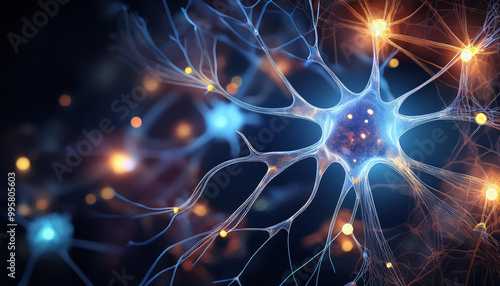 Abstract neurons branching out and connecting through glowing synapses. Brain activity, science