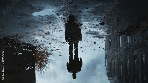 A solitary man is seen walking through a cityscape, his silhouette mirrored in a dark puddle, creating a contrast with the cloudy atmosphere above